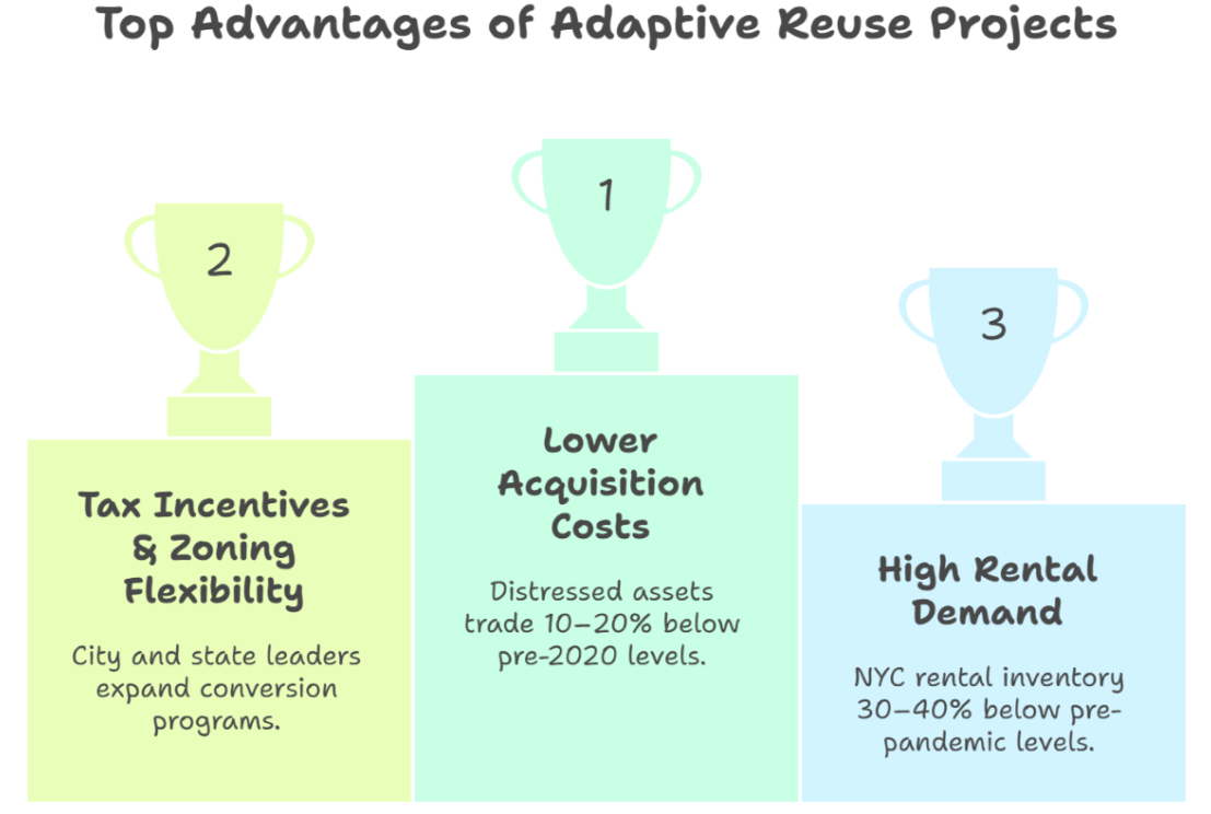 Unlike ground-up development projects, adaptive reuse allows investors to capture shorter timelines, lower carrying costs, and have a faster path into income-producing status.